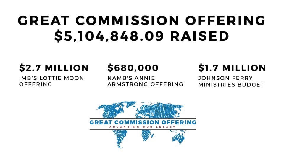 Atlanta area megachurch Johnson Ferry Baptist announced the results of their annual Great Commission Offering. It was suitably mega with over $5 million given. The offering was divided: $2.7m Lottie Moon, $1.7m Johnson Ferry missions budget, and $680k Annie Armstrong. That’s a single SBC church giving about 1.5% of the total Lottie Moon offering.
